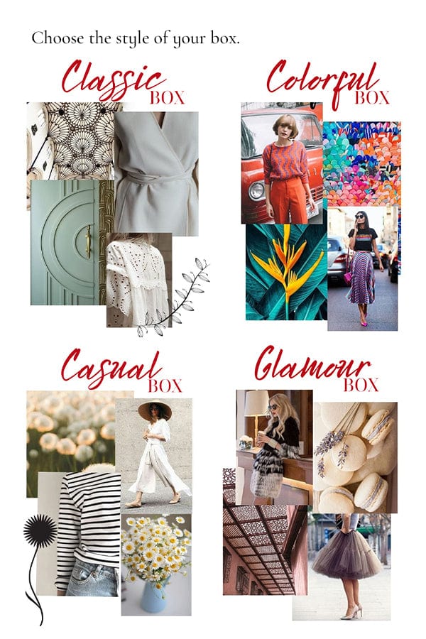 The Glamour Style -  Order this box if you love to stand out in true feminine style and dress to impress no matter the occasion! Colors and patterns you gravitate towards usually have a little bit of shine, femininity, glam, and sophistication. Warning: this box will contain some sparkle, feathers, rhinestones, or playful textures.